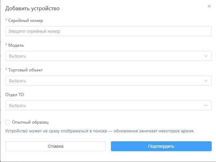 Пометка устройства Опытным образцом (необязательно)