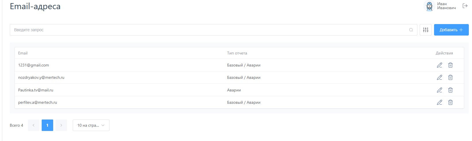 Также в каждой строке есть кнопка удалить, которая после подтверждения позволяет удалить почту из системы.