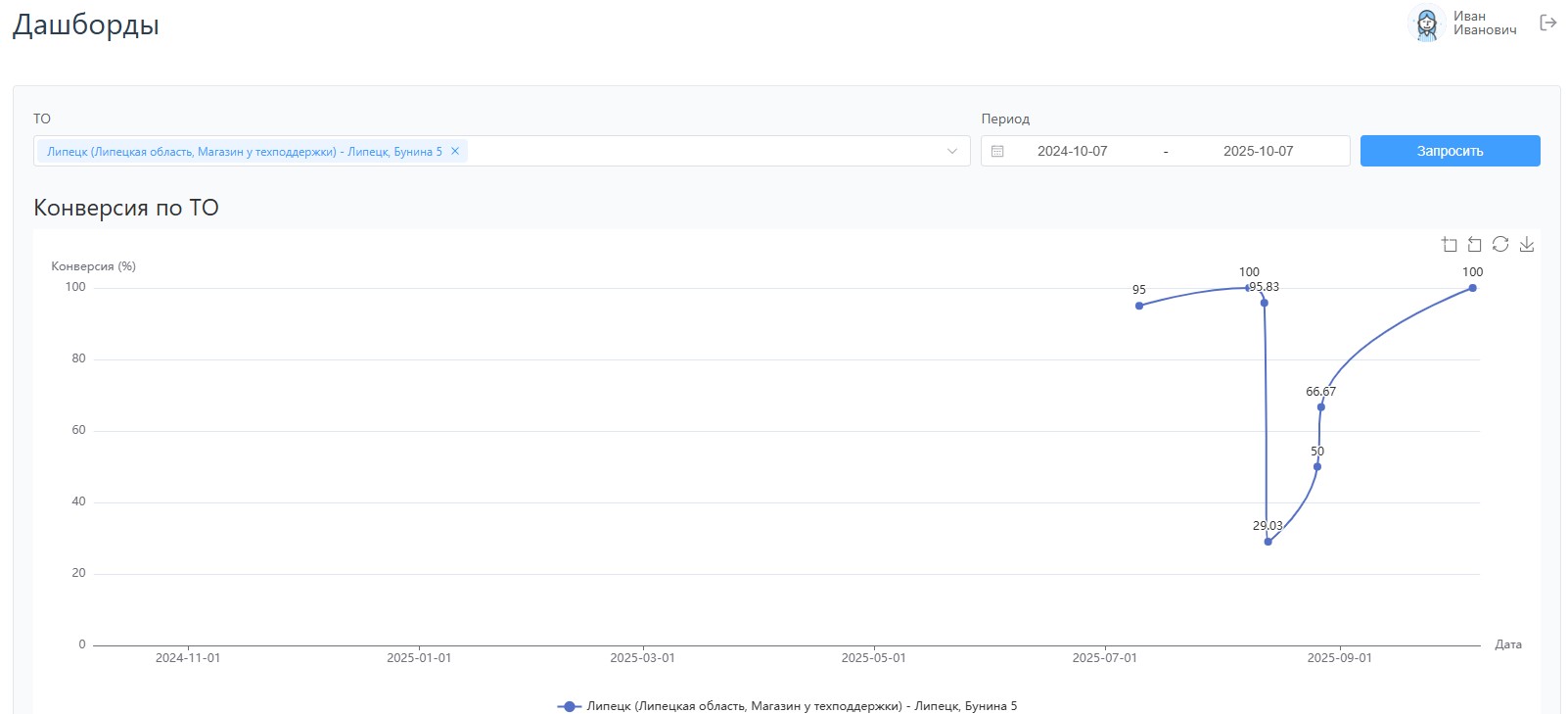 Настроив временной период, показывает изменение конверсии по всем торговым объектам и количественные характеристики по методам выбора товара клиентами для каждой даты.