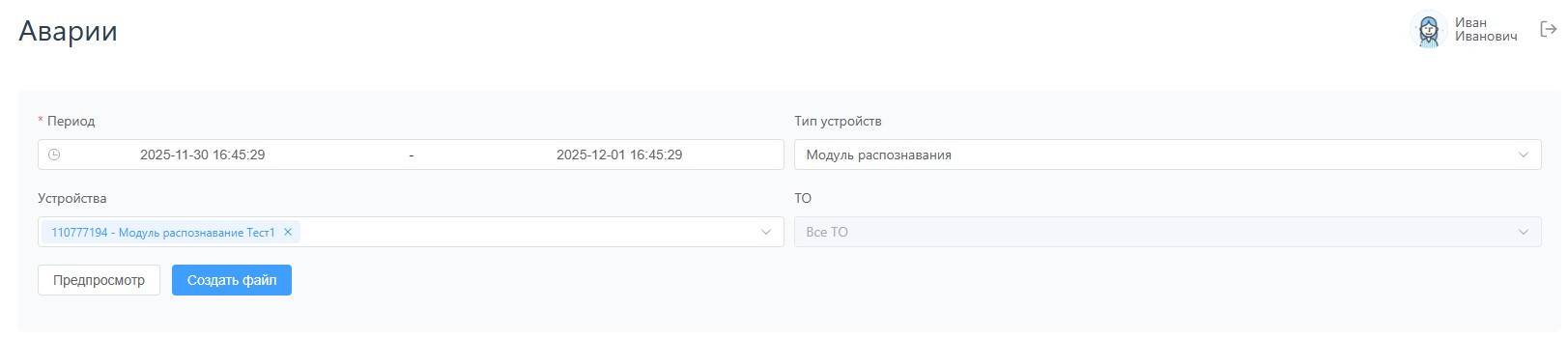 Предпросмотр — для отображения информации об авариях в таблице снизу