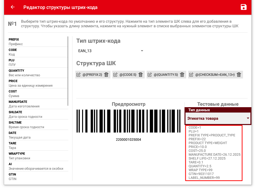 В поле «Тестовые данные», при выборе типа этикетки, отображается набор значений предполагаемых для размещения на этикетке.