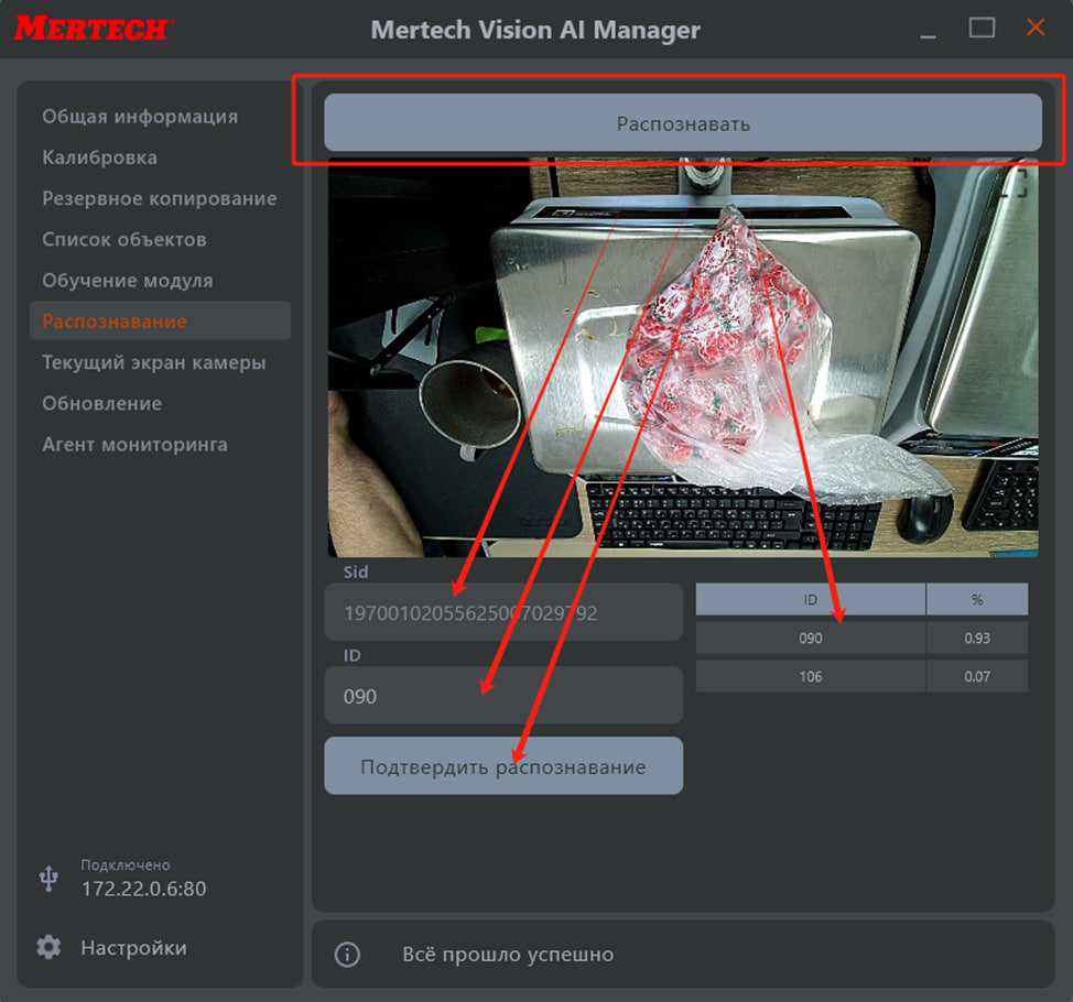 В разделе «Распознавание» можно протестировать работу системы на текущем изображении с камеры и подтвердить результаты распознавания.